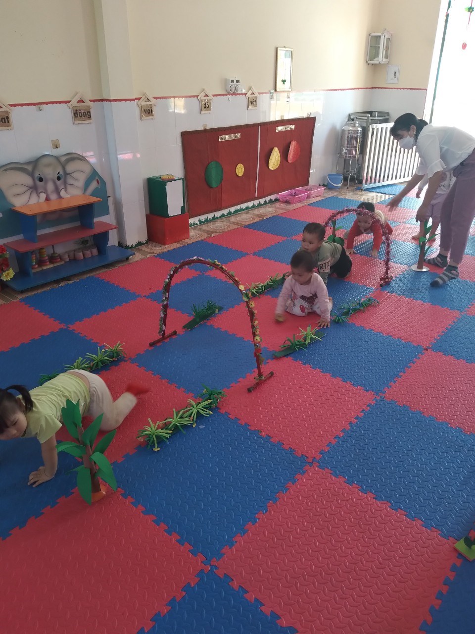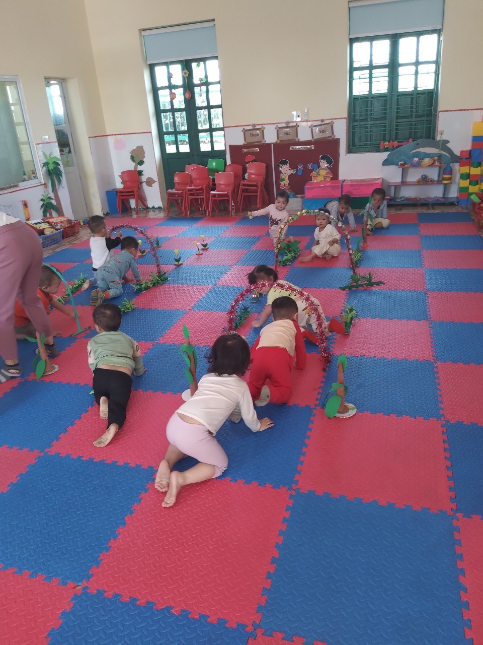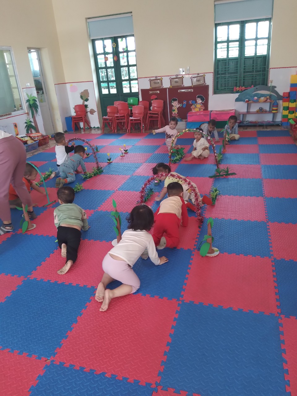Ở giờ học thể dục: các con được tập luyện các kĩ năng đi, chạy, nhảy, bò, trườn, lăn và ném bóng giúp cơ tay và chân phát triển tối đa. Ngoài ra con còn được tập những kĩ năng phát triển sự khéo léo qua các hoạt động xâu hạt, đóng, mở , tháo, lắp hộp, xếp chồng các khối gỗ, nhặt các vật nhỏ bằng 2 ngón tay, vạch các nét nguệch ngoạc ….Không chỉ phát triển thể chất, con được các cô tập một số thói quen tốt trong ăn uống, vệ sinh như: đi vệ sinh đúng nơi quy định, đeo yếm, rửa tay trước khi ăn, tập cởi quần, áo khi bị bẩn hoặc ướt..