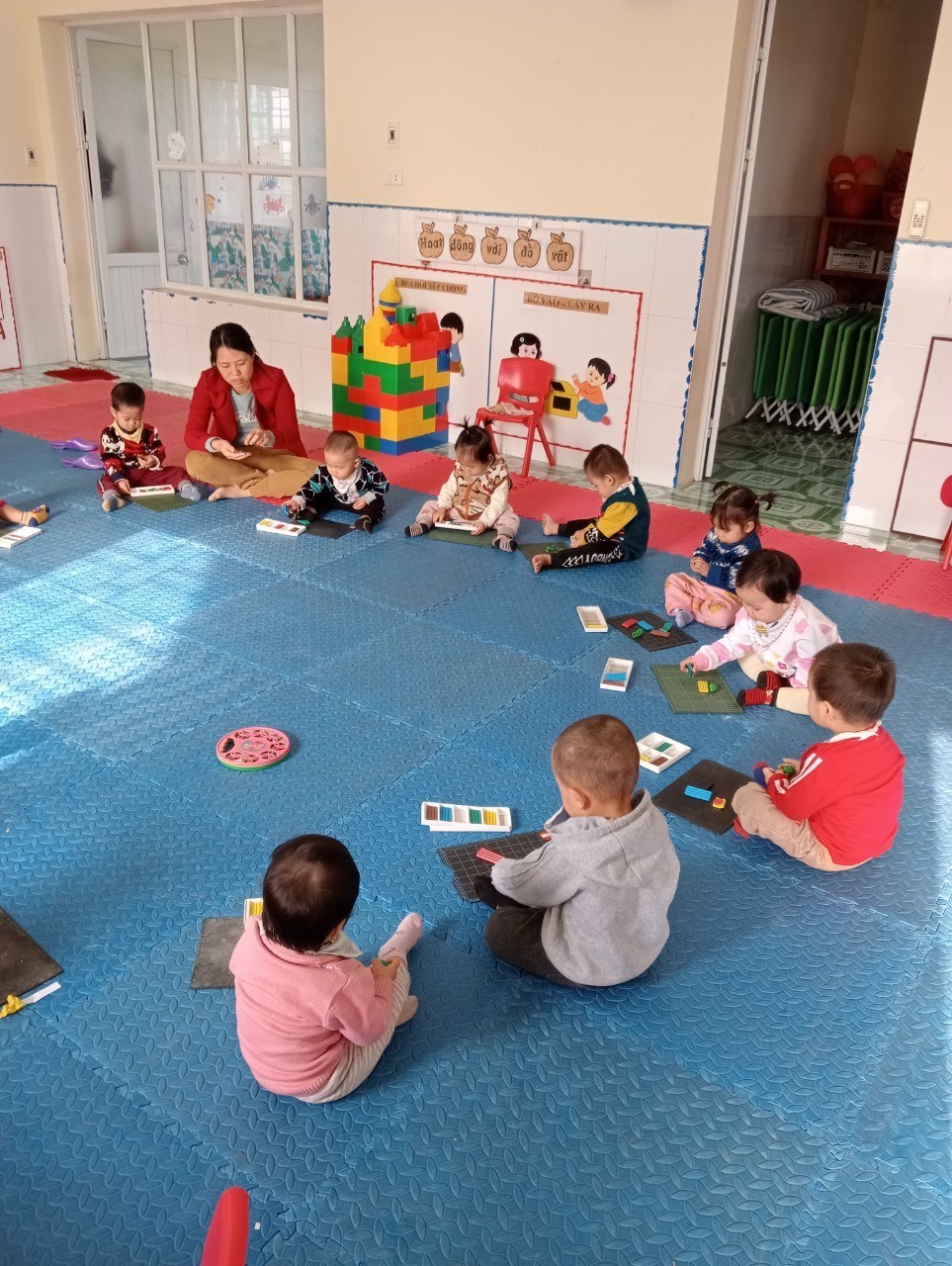 Để phát triển các kĩ năng toán sau này, các con được làm quen với 3 màu cơ bản xanh, đỏ, vàng, làm quen với kích thước to-nhỏ, gọi tên hình tròn, hình vuông, tập nhận biết số lượng một và nhiều... thông qua giờ học nhận biết phân biệt tại lớp.