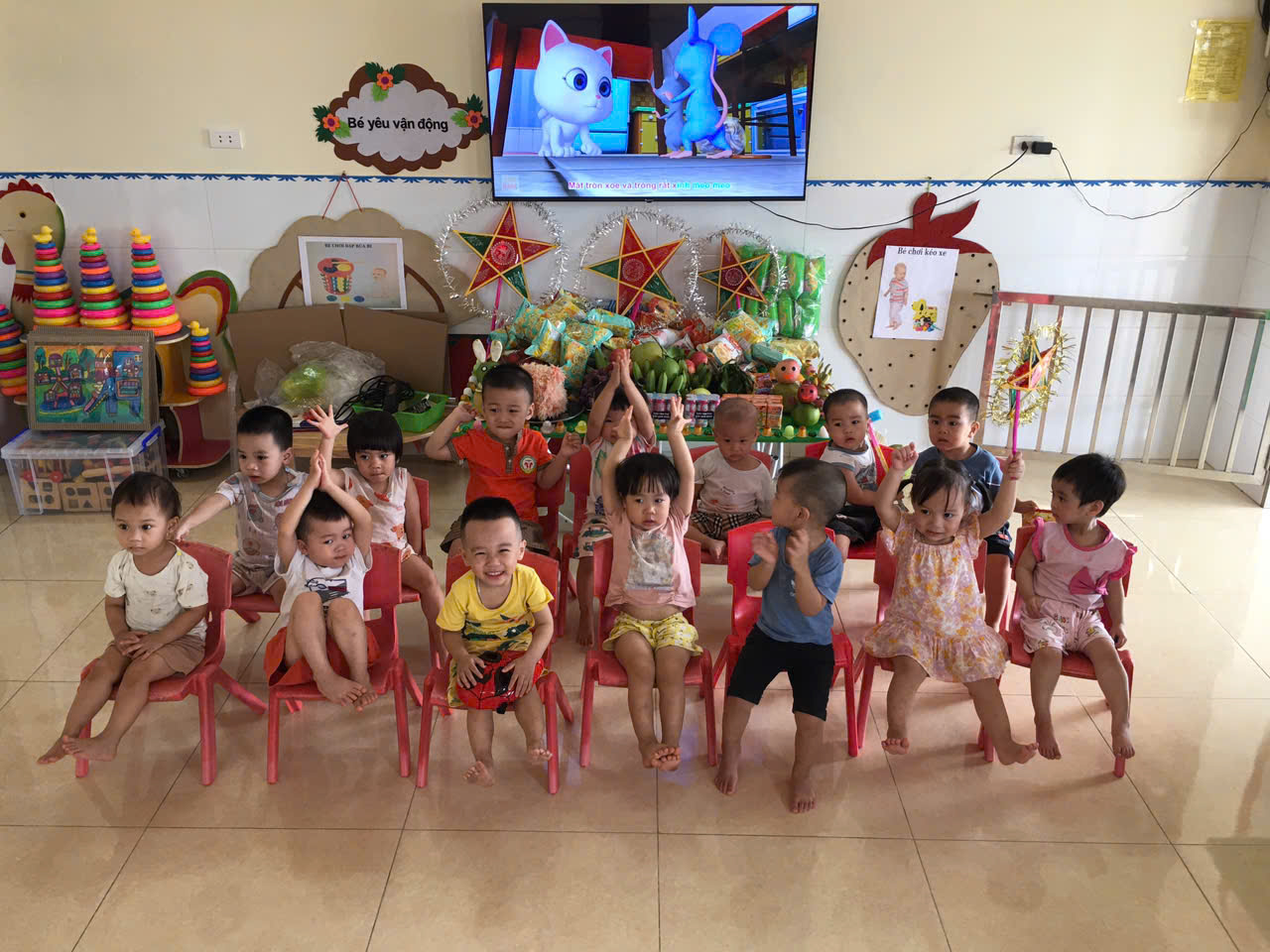Hai tuần trước chúng tớ đã cùng cô tập thật nhiều bài hát, bài múa, tập nhảy lân, múa cù, làm mặt nạ lồng đèn thật nô nức. Thế nhưng ... những cơn bão lũ tràn về tàn phá miền Bắc thân yêu, khiến cho nơi ấy nhiều bạn nhỏ như chúng mình mất cha mẹ, không được đến trường, không còn nhà để ở, không áo quần để mặc... Thật đáng thương biết baoDù chúng mình còn bé chưa hiểu nhiều về bão lũ, nhưng nhìn bạn nhỏ bị lạnh, bị ướt, mất ba mẹ chúng mình đã thật buồn, đã bật khóc vì thương bạn…