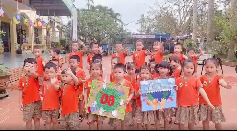 Hình ảnh các bạn nhỏ lớp 4 tuổi B1 cùng nhau làm tranh để sẻ chia, truyền tải đến tất cả mọi người thông điệp về một trái đất xanh, sạch, đẹp.