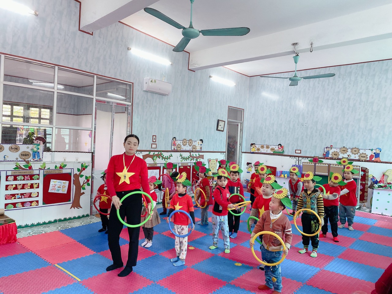 Trẻ tập vận động " Bật liên tục qua 5 ô vòng"