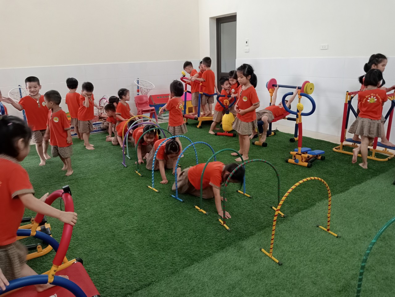 Các dụng cụ giúp bé tập luyện sức khỏe tốt hơn được lắp đặt ngoài trời như: Dụng cụ đạp chân mini. Dụng cụ đạp xe tựa lưng cho bé. Dụng cụ đi bộ trên không. Dụng cụ tập lưng eo mini. Tập vai đôi mini. Dụng cụ tập xoay eo mini. Dụng cụ xà đơn. Thang vận động ngang. Vận động chữ X. Xà đu đa năng. Thang leo cầu vồng. Thang leo cầu vồng đôi có trụ. Dụng cụ lắc hồng. Mâm xoay mini. Nhà banh cầu trượt. Nhà chồi vận động.