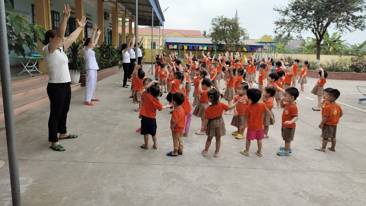 Hình ảnh trẻ tập thể dục sáng hàng ngày của các bé lớp nhà trẻ D4: