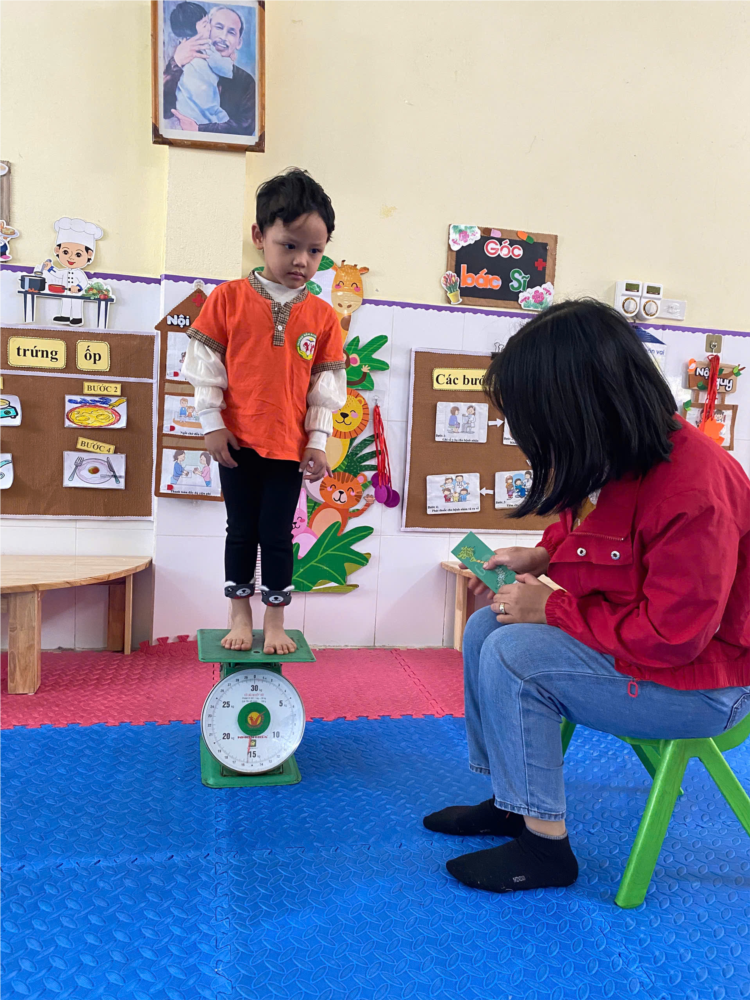 Kết quả kiểm tra cân đo của trẻ đã được giáo viên phụ trách lớp ghi chép cụ thể trong sổ theo dõi sức khỏe, chấm biểu đồ phân loại sức khỏe trẻ và được giáo viên các lớp thông báo đến phụ huynh, đặc biệt là một số trẻ suy dinh dưỡng thấp còi, trẻ béo phì qua đó phụ huynh cùng phối hợp có biện pháp quan tâm kịp thời cho trẻ. Cân đo định kỳ cho các trẻ là hết sức thiết thực và ý nghĩa thông qua việc cân đo định kỳ cho trẻ đã góp phần không nhỏ vào việc nâng cao nhận thức cho phụ huynh về ý thức về việc quan tâm chất lượng dinh dưỡng cho trẻ, góp phần giảm thiểu tỉ lệ suy dinh dưỡng , thấp còi, béo phì ở lứa tuổi mầm non và cũng qua hoạt động này đã đem lại sự phấn khởi, tin tưởng trong các bậc phụ huynh về một môi trường giáo dục an toàn và thân thiện.