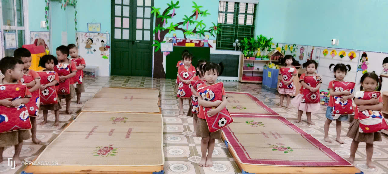 🛏️ Lên giường ngay ngắn – Bé nhẹ nhàng xếp hàng, lấy gối và nằm vào chỗ theo đúng dãy bạn nam - bạn nữ, chờ cô đắp chăn, có bạn còn tự kéo chăn.