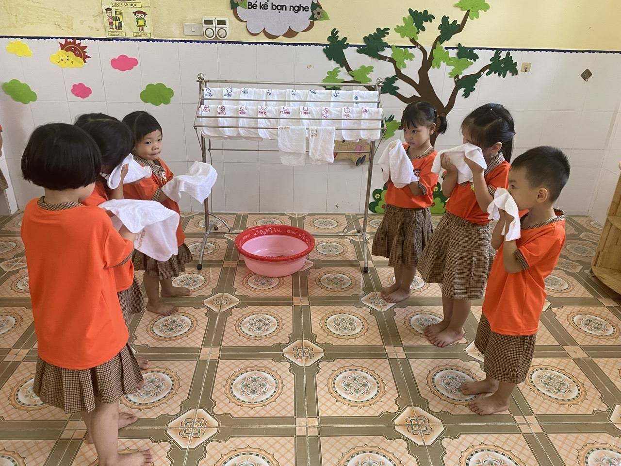 Mỗi ngày, trước khi ăn, sau giờ vui chơi hay sau khi đi vệ sinh, các bé đều được cô giáo hướng dẫn rửa tay sạch sẽ theo quy trình sáu bước. Từ việc làm ướt tay, lấy xà phòng, chà rửa lòng bàn tay, mu bàn tay, kẽ tay cho đến chụm đầu ngón tay xoay vào lòng bàn tay còn lại, cuối cùng rửa sạch bằng nước và lau khô bằng khăn riêng – tất cả đều được trẻ thực hiện đúng cách. Hoạt động tưởng chừng đơn giản ấy lại mang ý nghĩa vô cùng quan trọng: loại bỏ vi khuẩn, phòng tránh bệnh lây nhiễm, giúp bé khỏe mạnh và an toàn hơn trong môi trường tập thể.