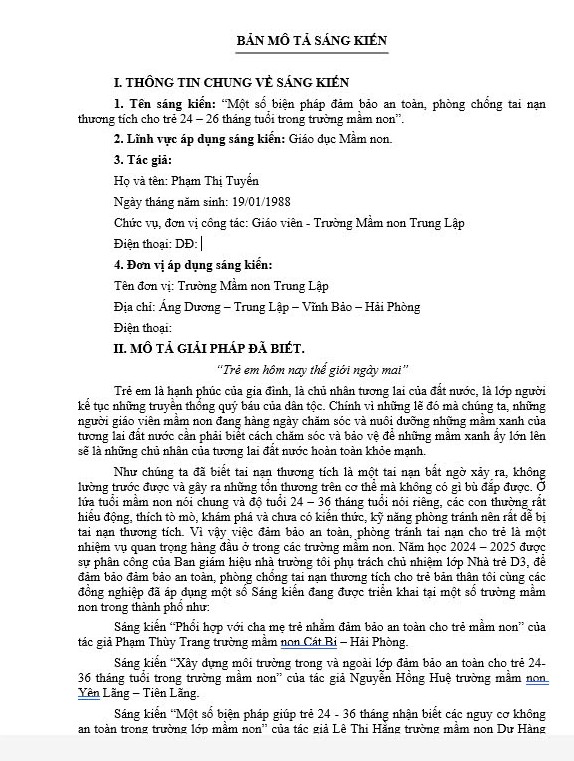 Trên đây là toàn bộ nội dung Bản mô tả Sáng kiến “Một số biện pháp đảm bảo an toàn, phòng chống tai nạn thương tích cho trẻ 24-36 tháng tuổi trong trường mầm non” và được áp dụng hiệu quả tại lớp/trường tôi đang công tác. Rất mong được sự đóng góp ý kiến của các đồng chí trong Hội đồng thẩm định Sáng kiến để Sáng kiến này hoàn thiện và thực hiện có hiệu quả hơn nữa.