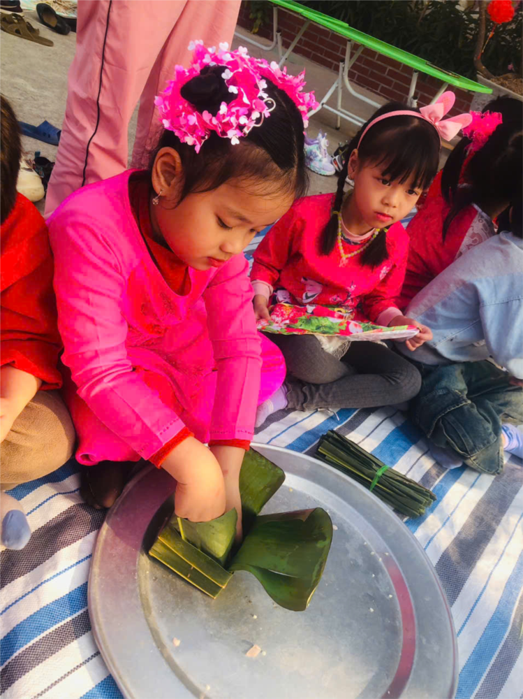 Trong buổi trải nghiệm các con được trải nghiệm tự tay lau lá dong, được học cách gói bánh chưng, được quan sát bố mẹ, cô giáo gói bánh, bé nào cũng rất vui và hào hứng. Qua hoạt động trên giúp các bé hiểu thêm về ý nghĩa của chiếc “Bánh chưng” và ý nghĩa ngày Tết cổ truyền dân tộc.