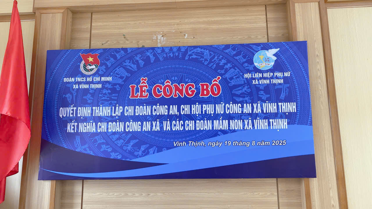 👉 Chiều ngày 19/8, Ban Thường vụ Đoàn xã và Hội Liên hiệp Phụ nữ xã Vĩnh Thịnh đã long trọng tổ chức Lễ công bố Quyết định thành lập Chi đoàn Công an xã, Chi hội Phụ nữ Công an xã Vĩnh Thịnh; chỉ định Bí thư, Phó Bí thư, Ban Chấp hành Chi đoàn Công an xã; Chi hội trưởng Chi hội Phụ nữ Công an xã Vĩnh Thịnh. Đồng thời, công bố Quyết định kết nghĩa giữa Chi đoàn Công an xã Vĩnh Thịnh và các Chi đoàn Trường Mầm non Thắng Thuỷ, Trung Lập, Việt Tiến.