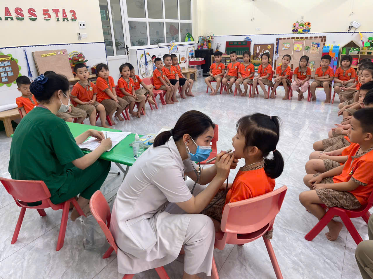 Trong buổi khám, các bác sĩ và nhân viên y tế 👩⚕️👨⚕️ đã tiến hành kiểm tra tổng quát cho trẻ bao gồm: đo chiều cao 📏, cân nặng ⚖️, kiểm tra tai – mũi – họng 👂👃, răng hàm mặt 😁, thị lực 👀 và đặc biệt là khám tổng quát nội – ngoại khoa.